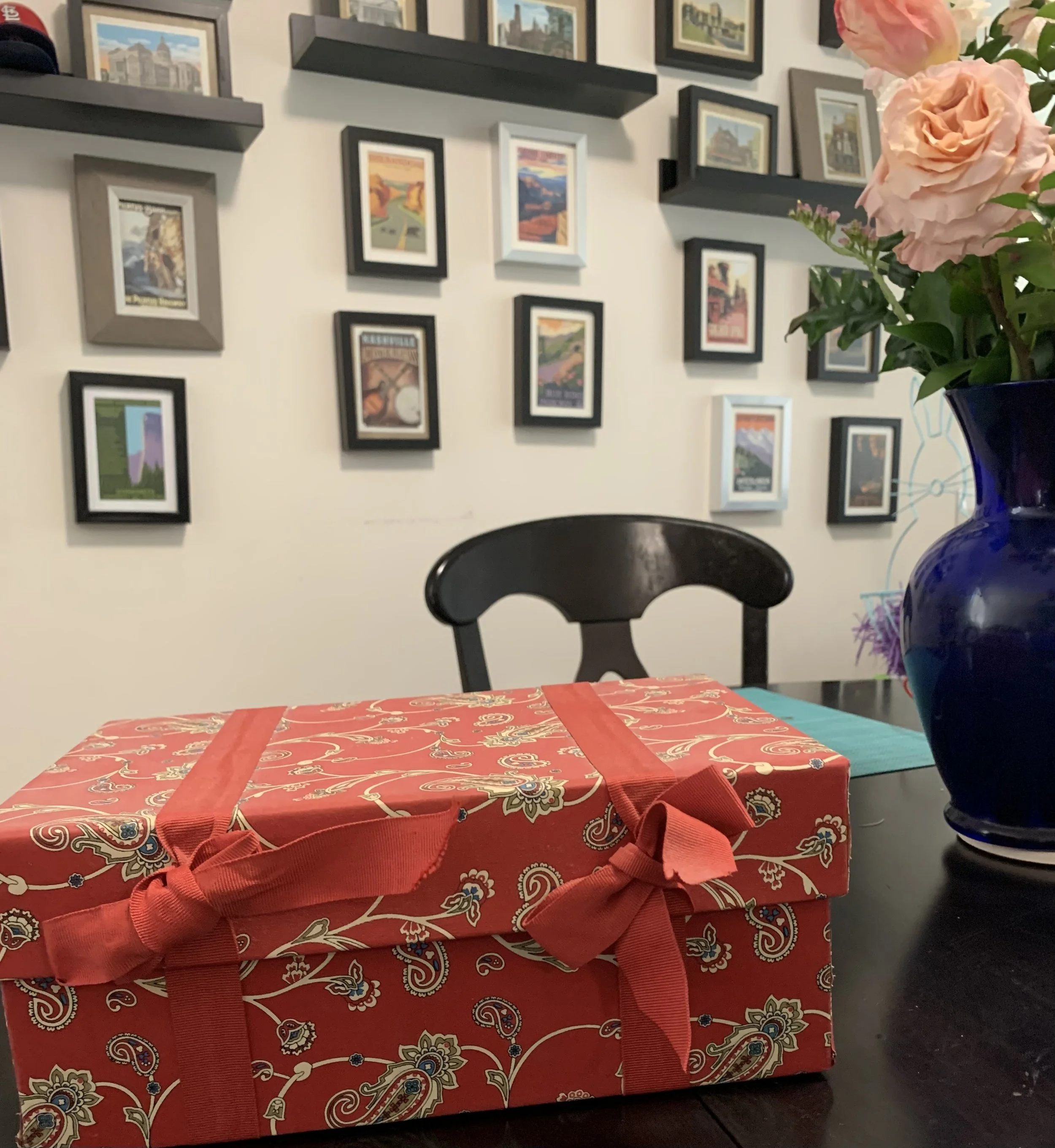 Most notably, when I moved to my new apartment, my mom and I created an accent wall utilizing frames from IKEA. In addition to postcards from my travels, I also used antique postcards from my grandmother’s travels. I love this accent wall and now in the time of Zoom meetings it has become a great conversation piece.