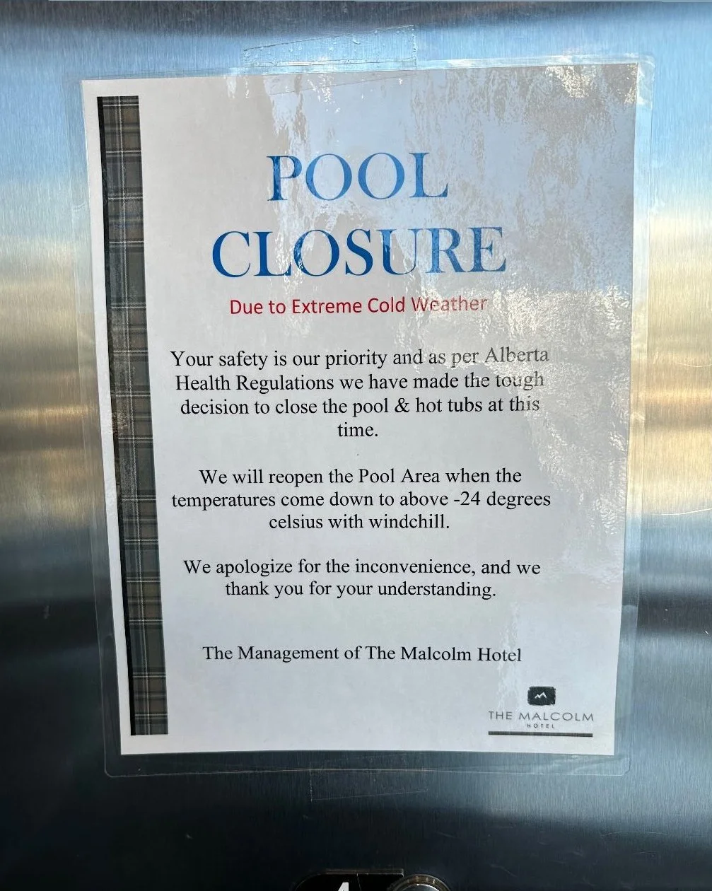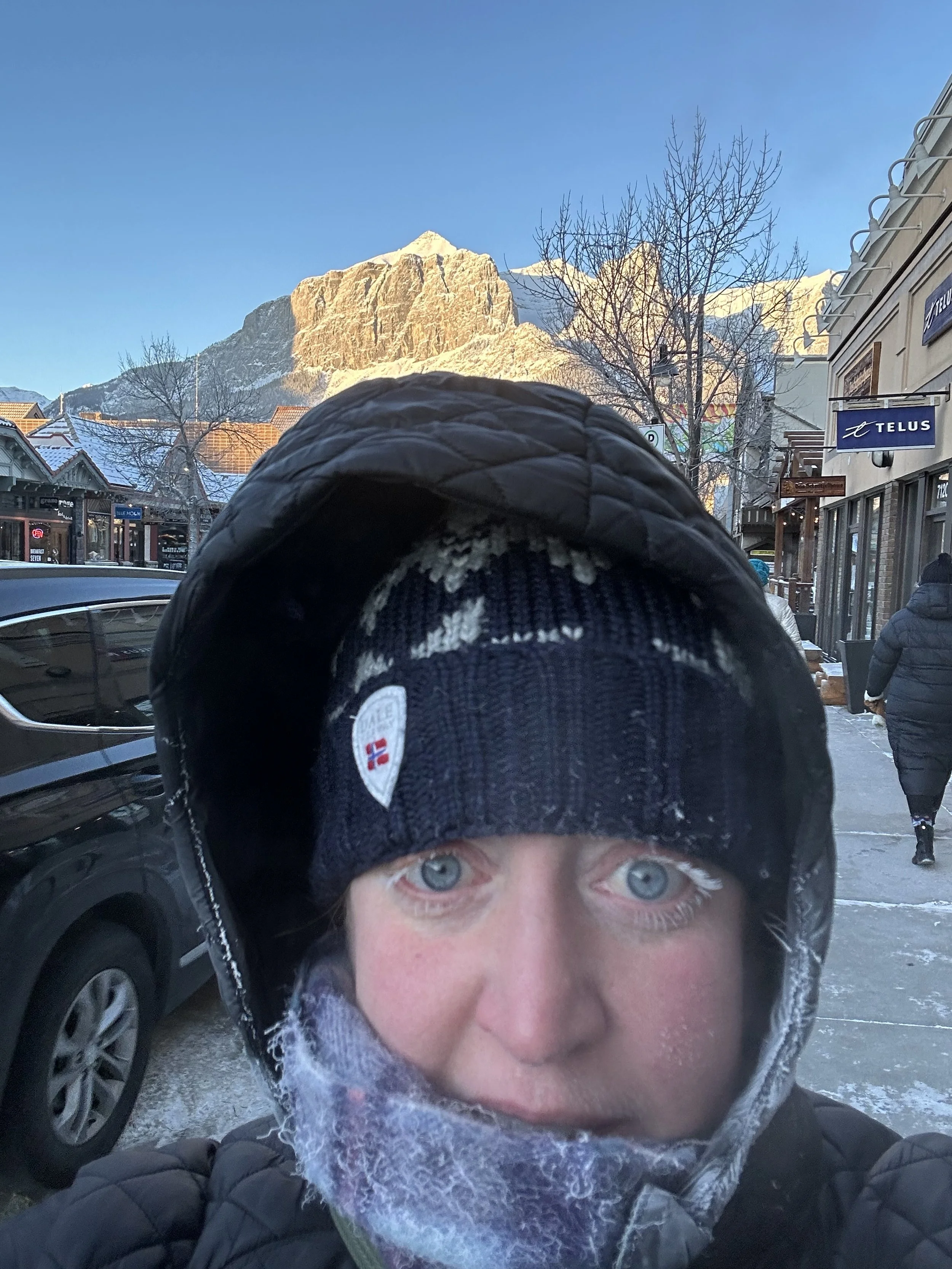 When planning for the trip, we were very excited about the cold weather hot tub. Imagining soaking in a hot tub, drink in hand, while gazing at beautiful mountains in the distance was a goal of this trip - in addition to celebrating our friend’s wedding, of course! However, when the Alberta Health Regulators closed the hot tub - I didn’t need to know the purpose behind this - it seemed rather obvious, -24ºC is the limit for outside pool weather.
